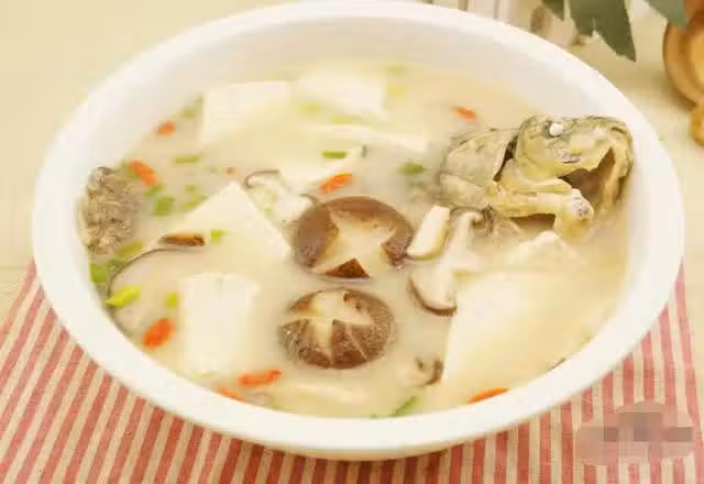 4、湯色變白後放入豆腐、香菇再煮5分鐘左右。