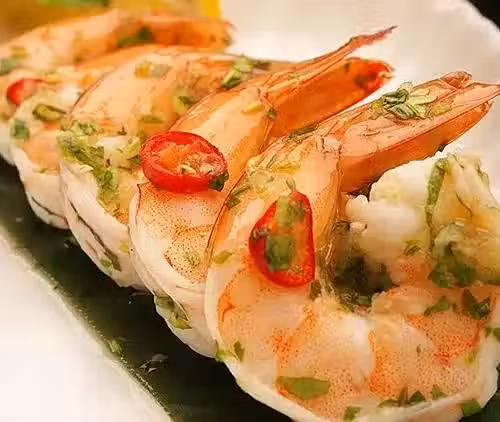 主輔料:大蝦、洋蔥、蒜、香菜、薄荷葉、蘋果、小米辣、檸檬汁、白糖、魚露、鹽