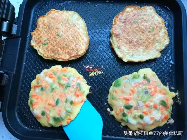 8、烙的時間不要太長,兩面金黃就熟了,時間太長蔬菜雞蛋餅失去水分過多,很容易干硬,雞蛋餅不軟乎,那就不好吃了哈。