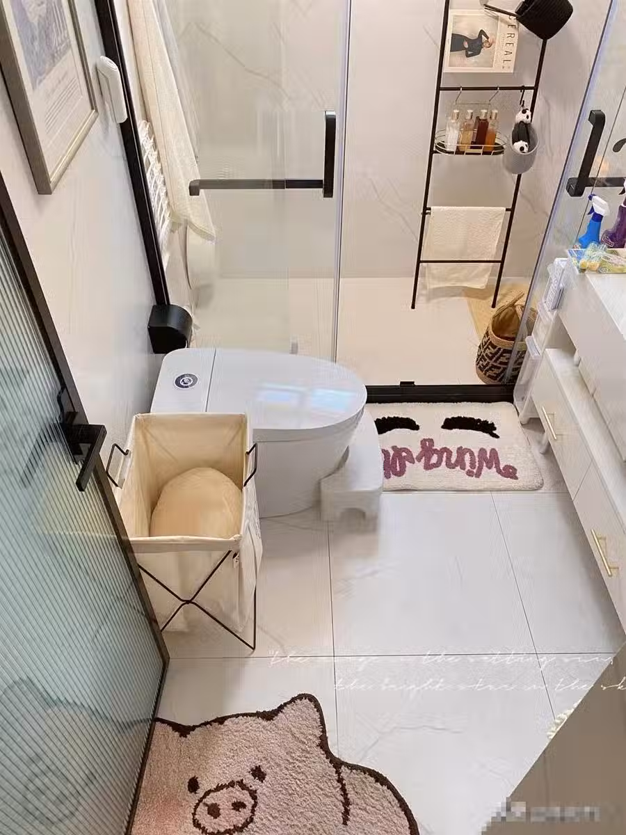 主衛只有7㎡大小,定位是純白色系自然清新的風格,所以墻面和地面通鋪了白色瓷磚,加上設置了台上盆的巖板洗漱台等等,整體就有了干凈明亮的效果。
