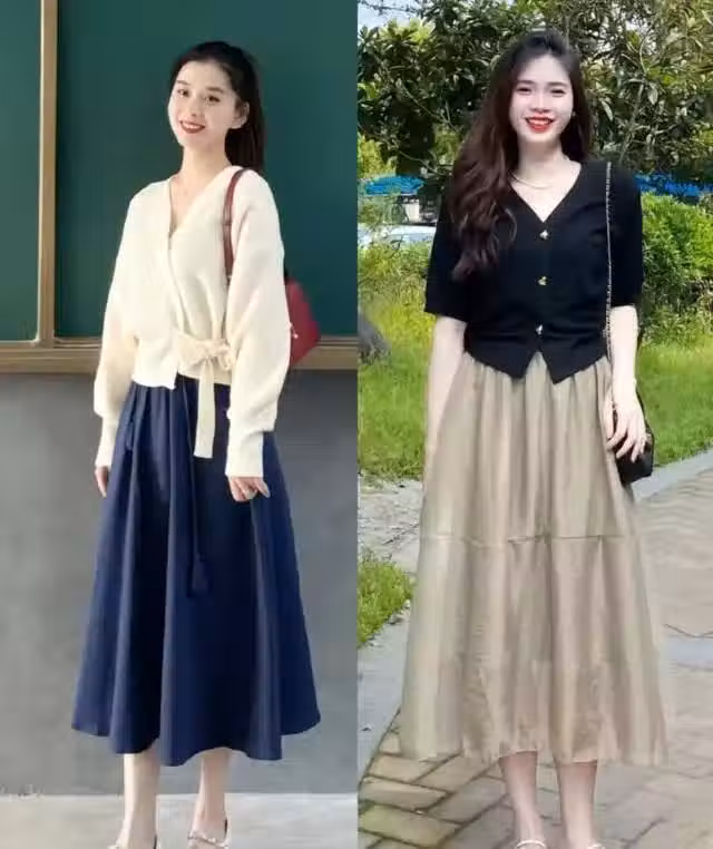 半身裙還是喜歡長至腳踝的款式,不僅飄逸唯美,而且也比較顯瘦顯高。白色針織衫搭配藏藍色半身裙,清新雅致的感覺,非常顯氣質,適合乖乖女。