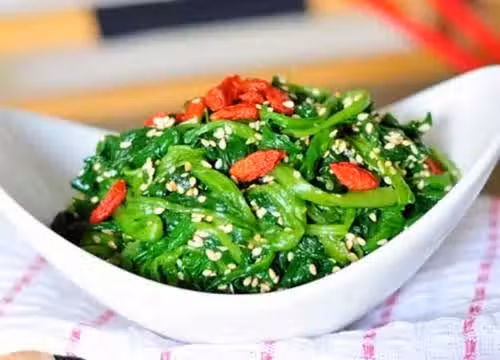 原料:菠菜、花椒、香油、香醋、醬油、糖、鹽、蔥花、紅辣椒粒、蒜蓉、薑蓉、黑胡椒粒、熟白芝麻。
