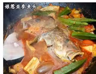 材料:紅棗魚頭1個,金楓葉適量,羊角豆(切塊)適量,茄子(切塊)適量,薑花,黃梨(切片)適量,番茄,羅望子汁1杯,鹽少許,糖少許 香料:大洋蔥2粒,蒜1大顆,姜50克,蔥頭100克,香茅2棵【攪爛】 做法:1.起鍋熱油,加入攪爛香料炒香至熟。2.炒至香料形成油脂,加入2000毫升的水。3.煮開後,改小火,加入亞參汁,羊角豆,茄子,番茄,黃梨煮至熟。4.最後加入魚頭,鹽和糖調味即可。
