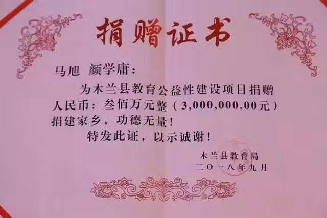 夫妻倆的捐贈分了兩批,第一批是300萬人民幣,第二批則是700萬人民幣。木蘭縣政府在徵得夫妻倆的同意後,在木蘭縣城內建起了一座名為「馬旭文博藝術中心」的公共建築,將來用於開展文化活動。這座藝術中心在2021年的6月30日建成了,馬旭與丈夫顏學庸一起為其揭碑。