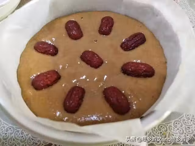紅棗洗凈,切兩半做表面裝飾,也可以用葡萄乾、蔓越莓干、枸杞代替。放入蒸鍋中,大火燒開,用中火蒸25-30分鐘,關火燜5分鐘。