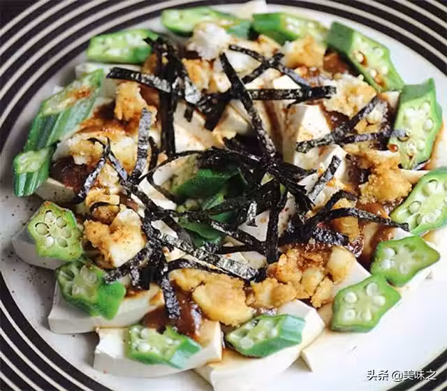 秋葵3個、海苔片少許、山藥1根、北豆腐1塊、味極鮮醬油少許、黑胡椒醬適量、辣椒粉適量。
