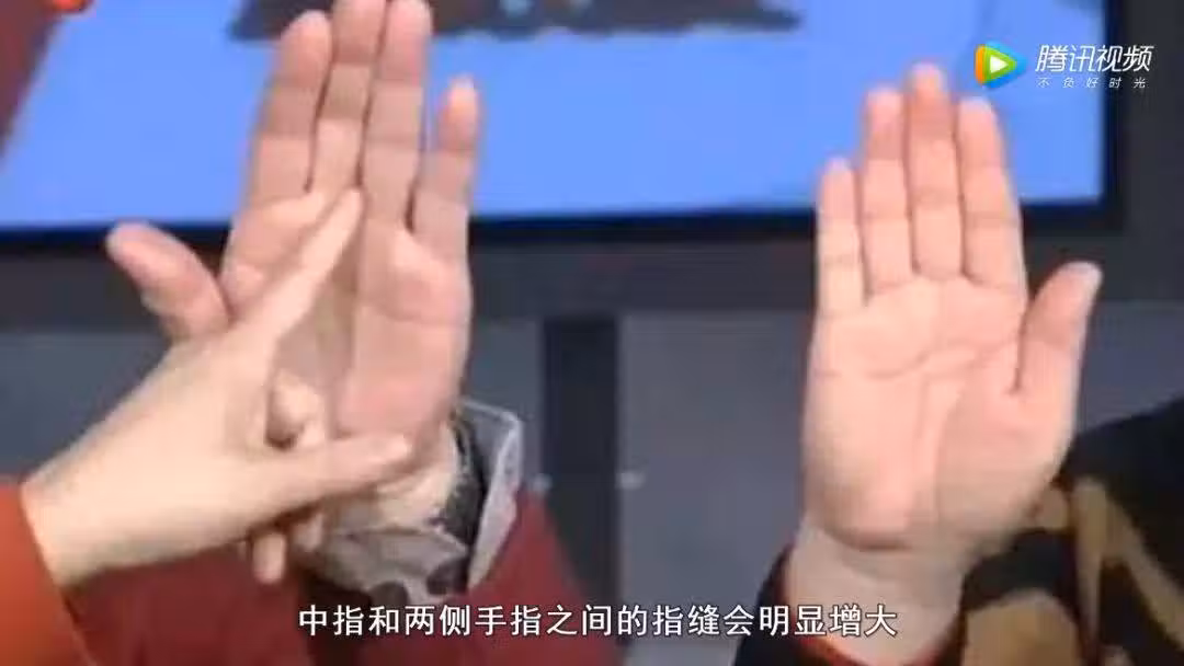 肝臟不好的人,手指的中指會和其他手指出現粗細上的明顯差別。一般是指根變細,中指和兩側手指之間的指縫明顯增大。