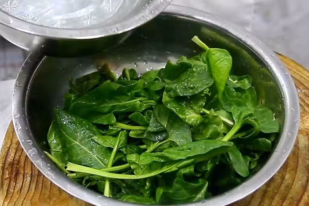 1、菠菜一把,洗凈後控乾水分;花生米適量放入盆中;大蒜拍扁切成碎末備用。