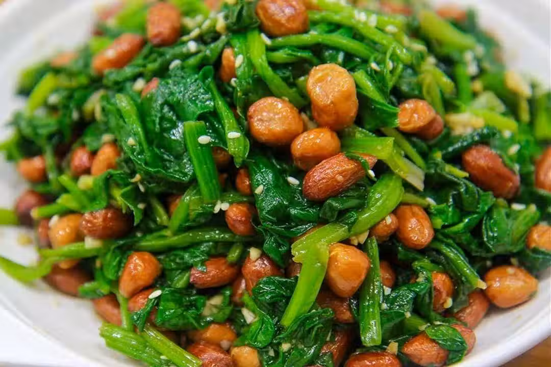 4、盆中放入蒜末,菠菜擠乾水分切成段放進去,加入食鹽、生抽、香醋、芝麻油、花椒油攪拌均勻,倒入花生顛盆拌勻、美味即成。