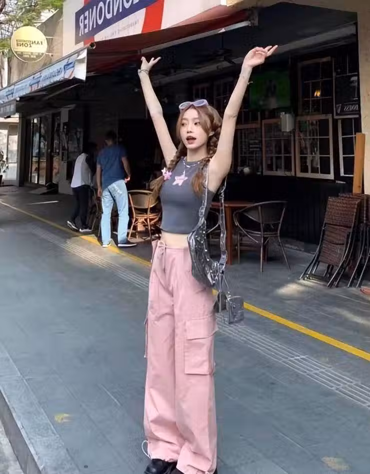 短背心的長度在胸部以下的位置。一定不要配高腰褲來穿,太呆板,沒有個性。會穿的潮人們,都是搭配低腰褲,露出小蠻腰。這也是今年y2k風格的經典穿搭方式之一。
