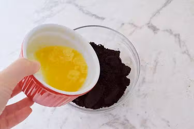 3、將準備好的奧利奧碎片放入碗中,然後加入已經融化好的黃油,將黃油與奧利奧充分混合。