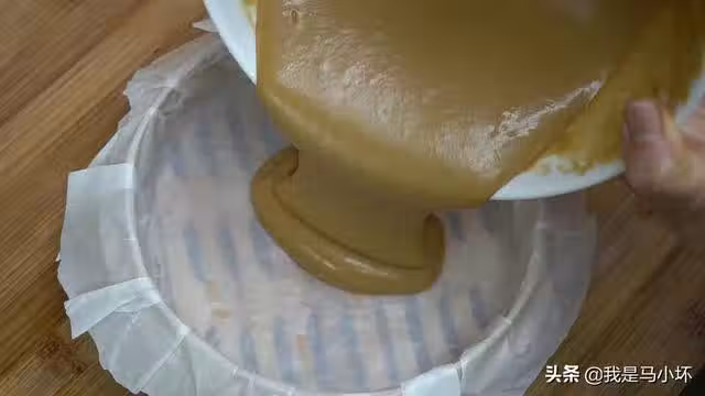 8、拿一個蒸籠,鋪上一層油紙,我這個差不多是6寸。或者碗也可以,碗底刷點油,蒸好後比較好脫模。倒上8分滿,蒸的過程面會發起來的,所以不能裝太滿。