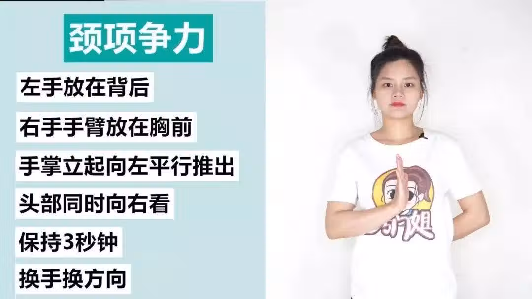 左手放在背後,右手手臂放在胸前,手掌立起向左平行推出,頭部同時向右看,保持3秒,換手換方向
