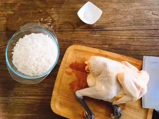 1.雞洗乾淨,晾乾水分(不會滴水就ok)。用細鹽(食用鹽)往雞身里裡外外抹一遍。