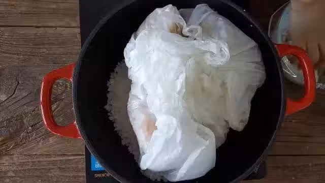 5.其餘的粗鹽蓋在雞上面,蓋上鍋蓋,開中小火煮,大概10分鐘左右調成最小火,慢慢焗一個小時。(期間會聽到噼里啪啦的聲音,這是 正常的雞在出水,蒸氣和熱鹽混合)。