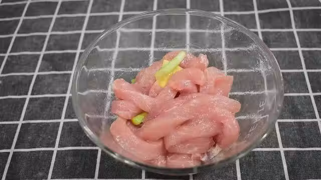 2、將切好的裡脊肉放入碗中,加入1勺料酒,1小勺鹽,胡椒粉少許,薑片蔥段,抓勻腌制15分鐘左右即可。