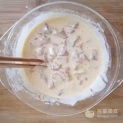 5、將腌制好的裡脊肉中的薑片撿出,倒入調好的麵糊中,攪拌均勻。