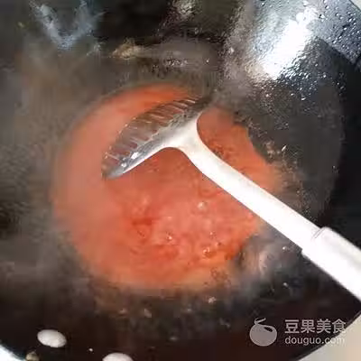 12、待水澱粉和番茄醬充分融合,並成粘稠狀,下入炸好的裡脊肉翻炒均勻沾上醬汁。