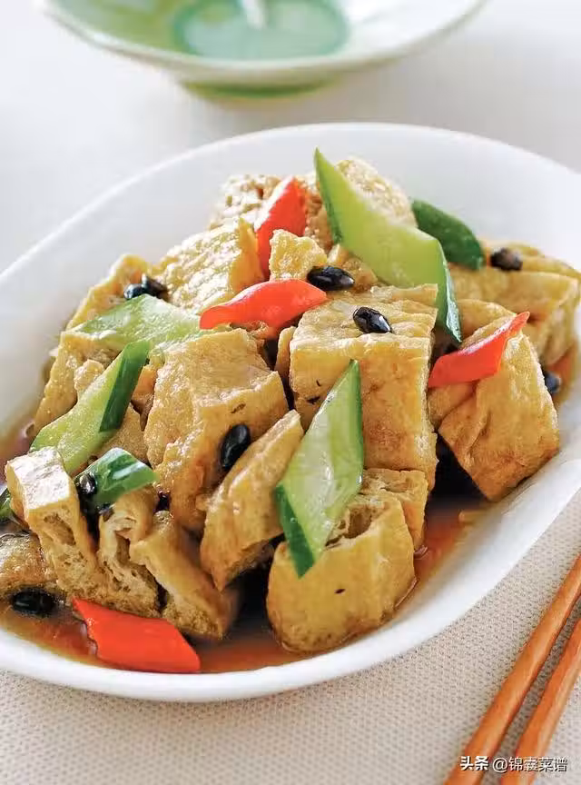2 熱鍋放香油,將豆豉、小黃瓜片、紅辣椒片放入鍋中爆香,再加入花干、水與其餘調料拌炒至湯汁略干即可。
