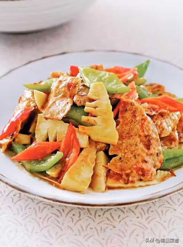2 熱鍋加入植物油,將青椒片、竹筍片、紅辣椒片、薑片放入鍋中炒香,再加入素肉片,並倒入辣椒醬、甜麵醬、番茄醬、白糖、水,以大火拌炒均勻。