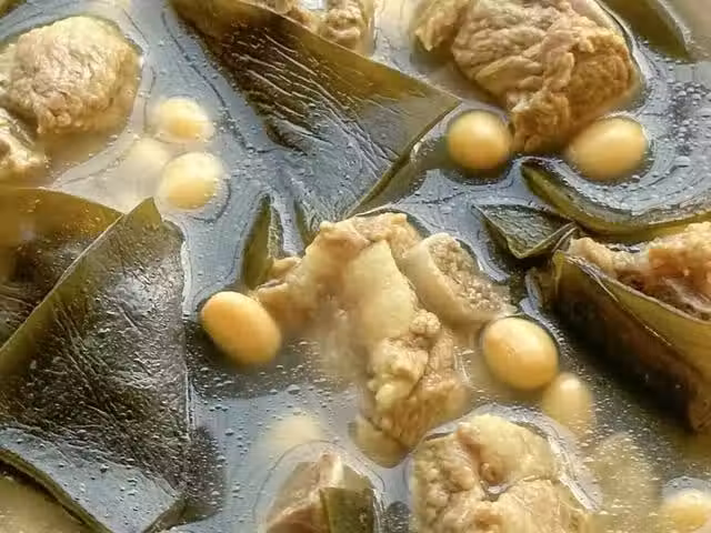 4、海帶黃豆排骨湯燉煮好了之後,加入適量的食鹽調味,再煮五分鐘煮入味即可出鍋開吃。