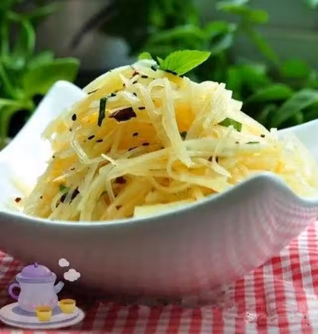 土豆2個 薄荷葉適量 鹽適量 油潑辣子2勺 白醋2勺 味精適量