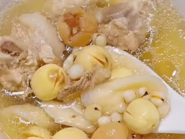 食材準備:蓮子、薏米、懷山藥、玉竹、桂圓、排骨、薑片、蔥段。