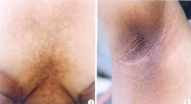 皮肌炎伴發惡性腫瘤的發生率會隨年齡而增加,常見於40歲以上患者,臨床表現為鮮紅色、棕紅色或火紅色瀰漫性斑,玻片壓之會消退,也稱為惡性紅斑,在臉部時表現為酒紅色斑,夾雜著點狀色素沉著斑。惡性紅斑的出現跟惡性腫瘤的可能高度相關,常見的伴發腫瘤有肺癌、乳腺癌、鼻咽癌、胃癌、卵巢癌、肝癌、腎癌、前列腺癌、白血病等。