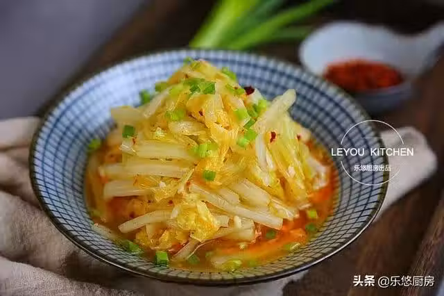 第一步:準備食材。白菜適量、蒜少許、干辣椒粉適量、香蔥少許。