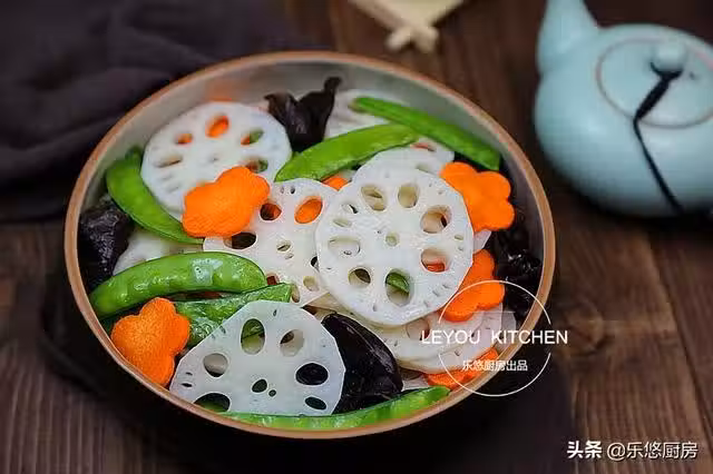 第二步:蓮藕去皮切成薄片、胡蘿蔔切片、木耳撕成小朵、荷蘭豆去掉兩頭的老筋,蒜切片備用。我把胡蘿蔔用模具壓成花朵形狀,這樣炒出來更好看。