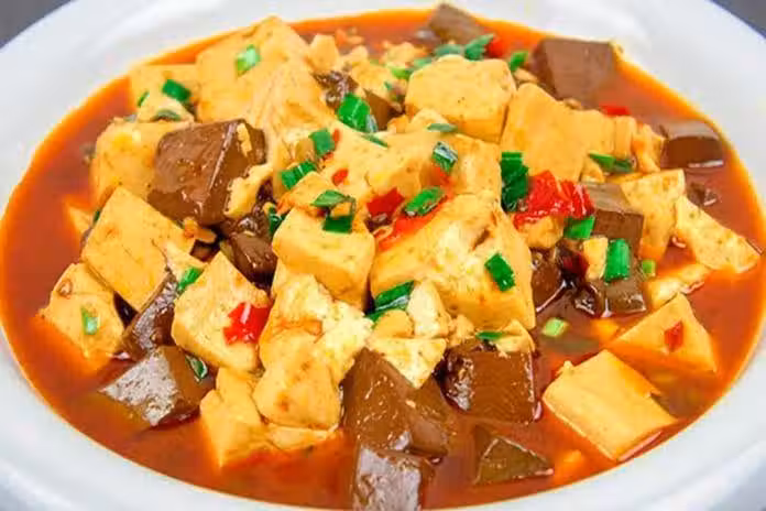 3.鍋內燒油,放入蒜末和蔥花爆香,加入豆瓣醬10克炒出紅油,放入適量的清水沒過豆腐和豬血,加入老抽提色、生抽鮮味、十三香2克、胡椒粉2克、食鹽2克、雞粉2克,少許白糖提鮮,開大火收汁。