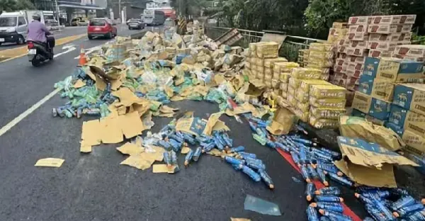 基隆一早500多箱飲料掉滿地!!「民眾狂撿」司機喊:不要再撿了,環保局回應了