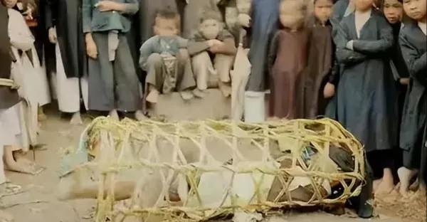 老照片:晚清時期,一名被浸豬籠的女子,躺在地上,民眾冷漠圍觀