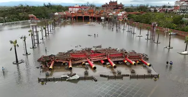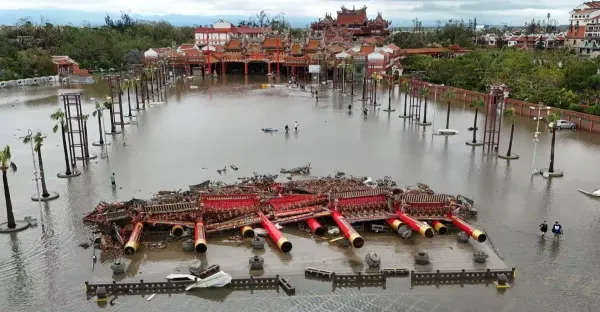 震撼高空圖曝!南鯤鯓牌樓全倒、信徒涉水護神 廟方曝重建金額