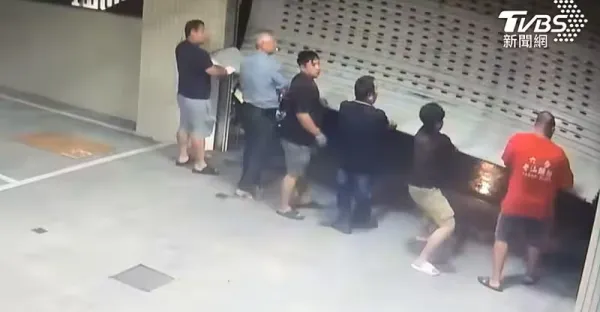被強風打敗!新建案鐵卷門吹掀 六壯漢扶門