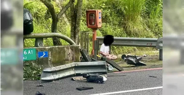 國道追撞衝出護欄!男駕駛車旁淡定打坐壓驚 路人全看傻