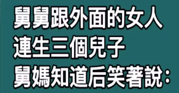 舅舅跟外面的女人連生三個兒子,舅媽知道後笑著說:你開心就好!舅舅直到臨終前,舅媽說出了真相