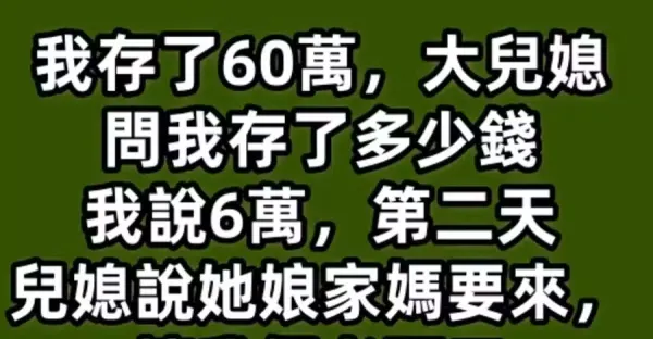 我存了60萬,大兒媳問我存了多少錢,我說6萬,第二天兒媳說她娘家媽要來,讓我們老兩口去小兒子家住,小兒媳立馬歡天喜地接我們過去了那架勢,仿佛我們多待一秒都是多餘的。