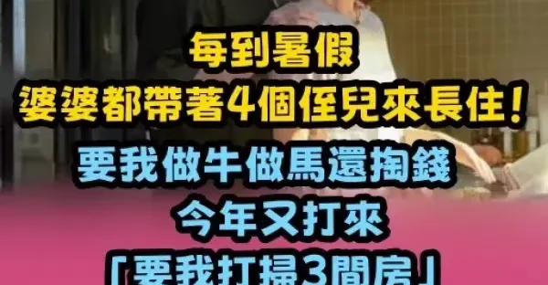 每到暑假,婆婆都帶著4個侄兒來長住!要我做牛做馬還掏錢,今年又打來「要我打掃3間房」女兒房間也要清出來,我默默「做一件事反擊」讓她氣得跳腳!