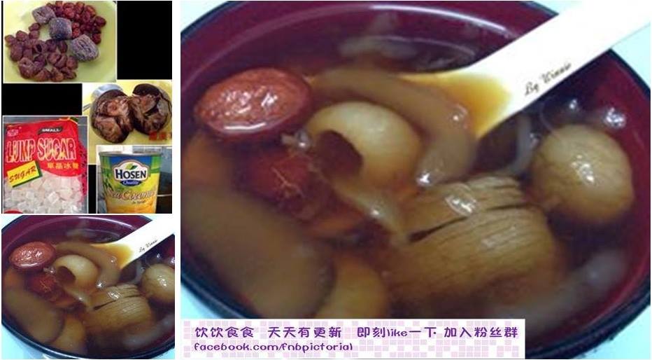 1.將清水煮滾後,加入龍眼乾,班蘭葉,海底椰,溶椰糖,白糖,煮約25分鐘。