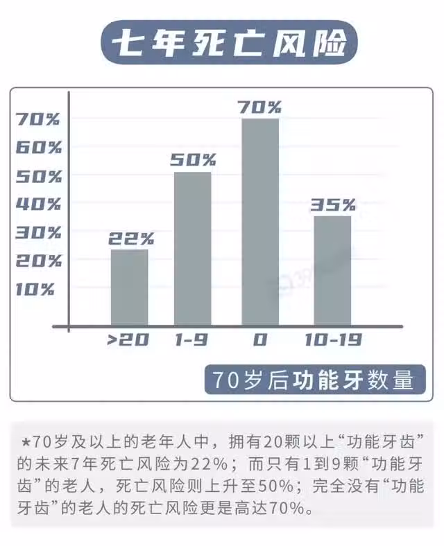 此外,丹麥科學家也有研究發現,人類最終保留的功能牙的數量與壽命長短有密切關聯。缺牙越多的老人,死亡風險越高(詳見下圖)