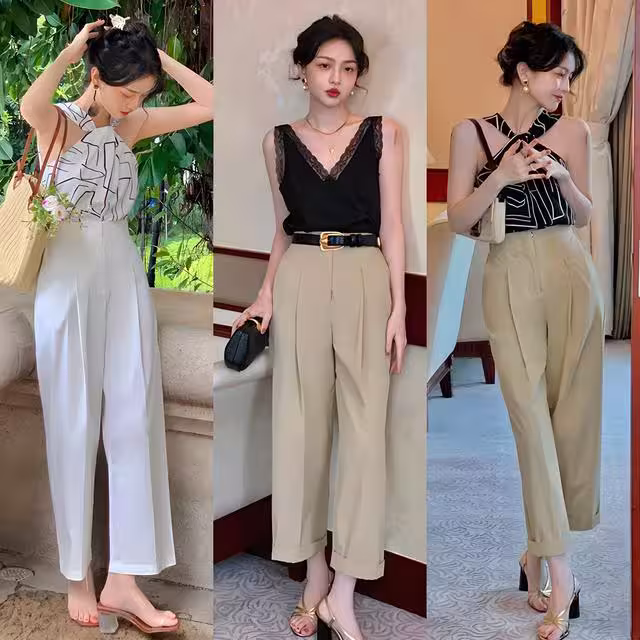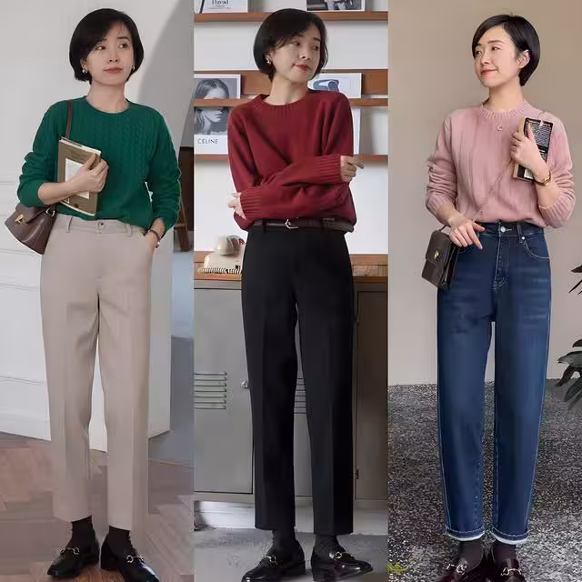 「上窄下寬」的梨形身材姐妹,很適合穿闊腿褲、煙管褲;腹部豐滿的蘋果型身材,可以通過錐形褲藏住贅肉;腰線明顯的沙漏型身材,穿修身西褲或九分褲,都能讓自己美得更出眾。