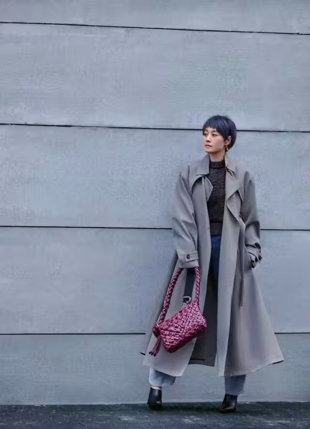 長款風衣在秋冬季流行度不低,鑒於衣長,個子高些的女生更容易駕馭,同時不擔心壓身高。此款風衣長度都快到腳踝了,大部分女性喜歡敞開穿,進而營造走路帶風的氛圍;長款灰色風衣十分百搭。再來看看內搭,馬伊琍選了一款黑色高領針織衫,天涼時,這種領口設計能有效保護頸部肌膚不受涼。