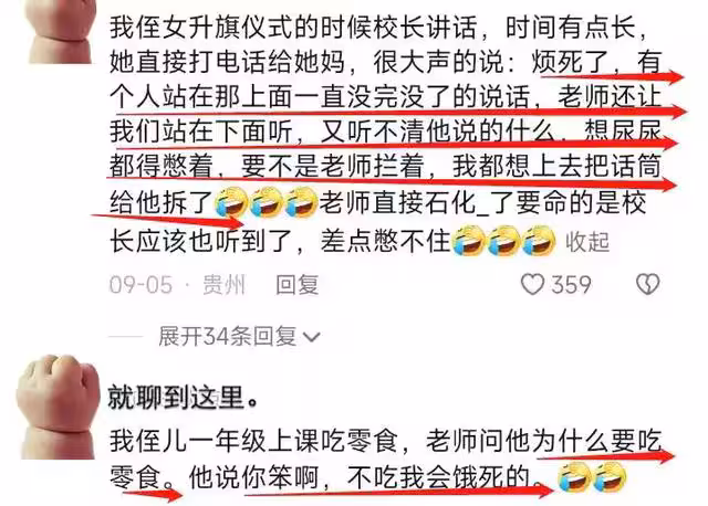 「有個人一直站在那沒完沒了地講話,煩死了,老師還讓我們站在下面聽,想要尿尿還得憋著,要不是老師攔著,我都想把話筒給他拆了。」