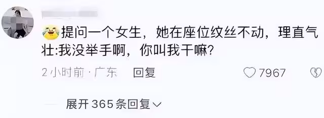 還有老師叫同學回答問題,這位寶寶坐著紋絲不動,理直氣壯地說:「老師,我沒舉手,你叫我幹嘛?」