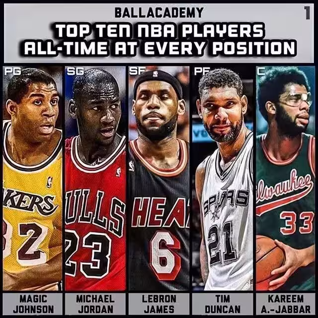 最佳1陣無疑是傳奇中的傳奇。魔術師是公認的歷史第一控衛,如果不是因為健康問題而早早退役,那麼他的履歷必然會更加輝煌。喬丹,「籃球之神」的稱號就是對其實力的最佳證明。他的每一次得分、每一次防守,都仿佛是在書寫籃球的傳奇。詹姆斯生涯榮譽無數,並創下了「411」紀錄。鄧肯是出道即巔峰的代表,19年生涯為馬刺隊帶來了5座總冠軍。賈巴爾擁有6冠 + 6MVP,他那標誌性的天勾和超長的巔峰期,使他成為中鋒位置上的傳奇。