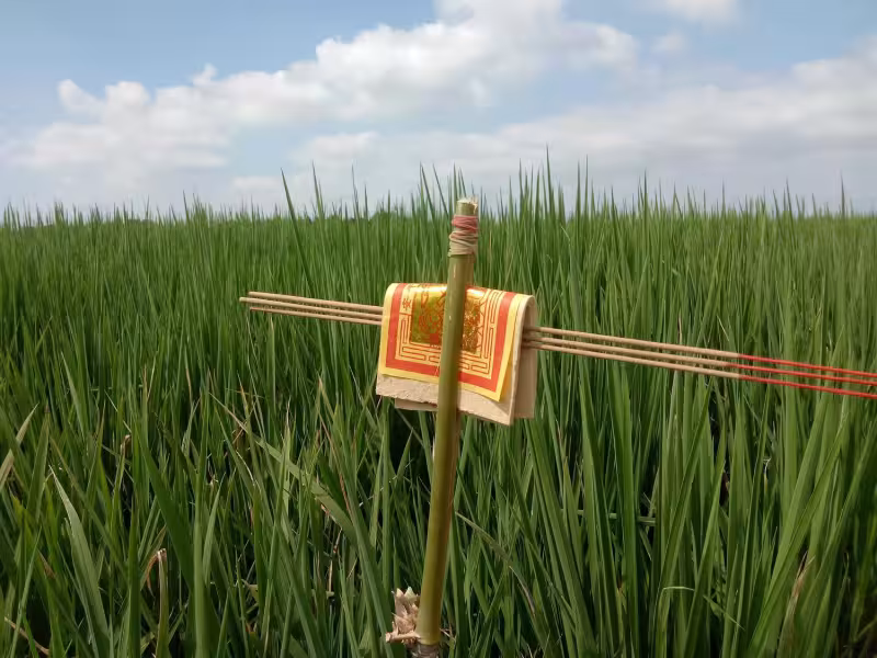 在中南部農村,秋分時節仍可見 「土地公拐」 的景象。農民會以竹枝立於田頭或田中央,系上土地公金,象徵邀請土地公巡田,感謝過去的耕作成果,祈求來年風調雨順。這個習俗源於古代「秋社」祭祀,是農耕社會對大地的感恩與祈福,如今仍在部分地區保留。
