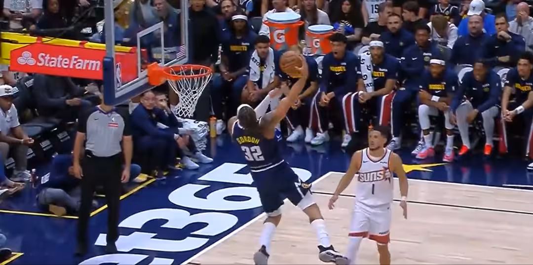 前面說了,掘金以133比111輕鬆擊敗太陽,其實戈登沒費多大力氣,他全場比賽出戰25分鐘左右,11投5中拿下17分2籃板1助攻3搶斷,在三分線外6投1中,對於他來說算是平平無奇的一天。 但戈登在比賽里還是盡力取悅球迷,他在第二節比賽跟隊友打了個精妙的配合:約基奇上線持球,穆雷提供掩護,戈登一個箭步衝到禁區,起飛,接到約基奇的傳球,完成了一次360度轉身扣籃。