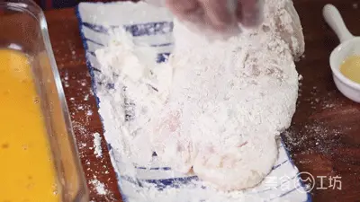 3. 巴沙魚柳依次均勻裹上麵粉、雞蛋液、乾脆面。