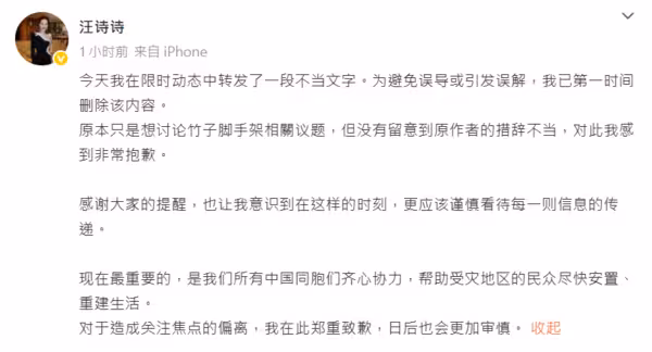 汪詩詩也表示,這次的爭議讓自己意識到,在這樣的時刻,更應該謹慎看待每一則訊息的傳遞,「現在最重要的,是我們所有中國同胞們齊心協力,說明受災地區的民眾儘快安置、重建生活。對於造成關注焦點的偏離,我在此鄭重致歉,日後也會更加審慎。」